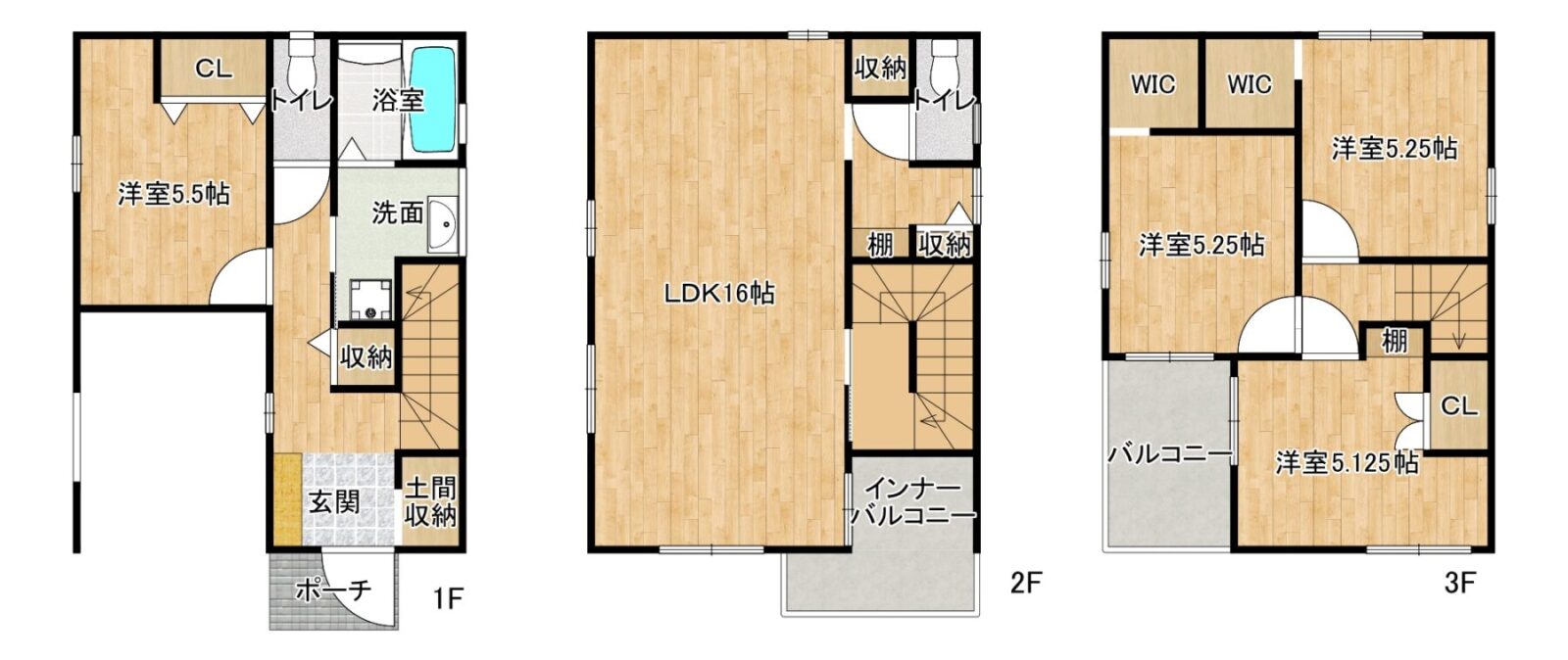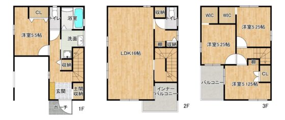 | 間取内容 | LDK16.0帖 2階 1室洋室5.5帖 1階 1室洋室5.25帖 3階 2室洋室5.125帖 3階 1室 | ||