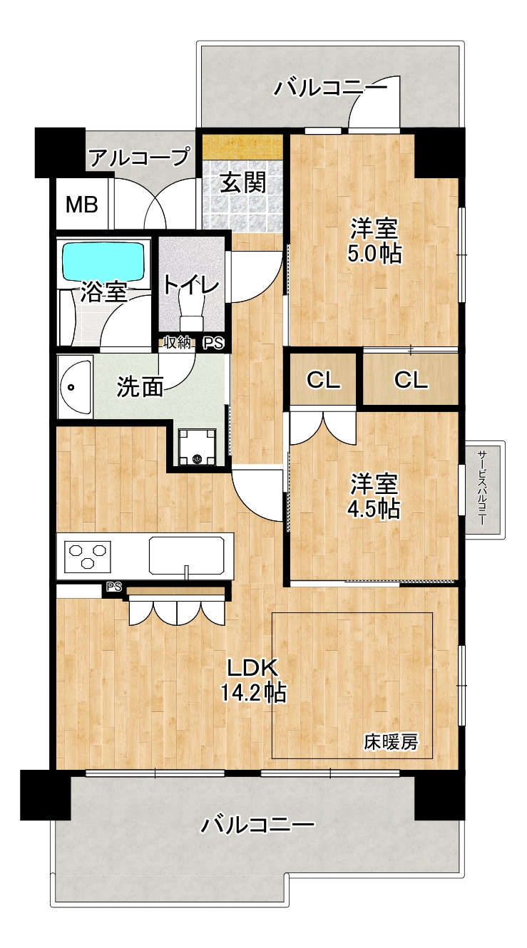 | 間取内容 | LDK14.2帖 1室洋室5.0帖 1室洋室4.5帖 1室 | ||