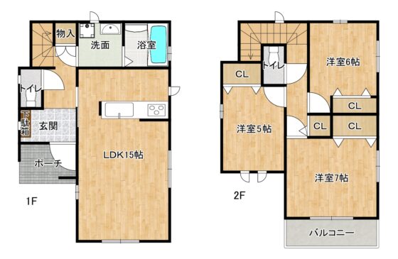 | 間取内容 | LDK15帖 1階 1室洋室7帖 2階 1室洋室6帖 2階 1室洋室5帖 2階 1室 | ||