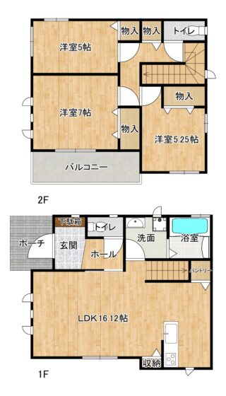 | 間取内容 | LDK16.12帖 1階 1室洋室7帖 2階 1室洋室5.25帖 2階 1室洋室5帖 2階 1室 | ||