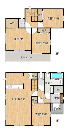 | 間取内容 | LDK16.5帖 1階 1室洋室5.25帖 1階 1室洋室7帖 2階 1室洋室5.25帖 2階 2室 | ||
