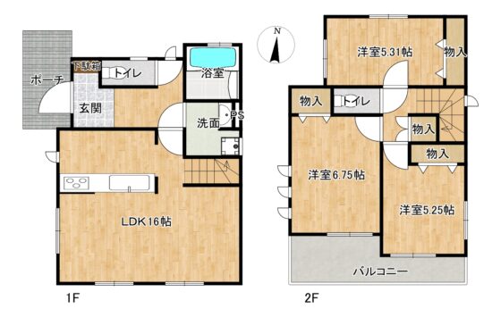| 間取内容 | LDK16帖 1階 1室洋室6.75帖 2階 1室洋室5.31帖 2階 1室洋室5.25帖 2階 1室 | ||