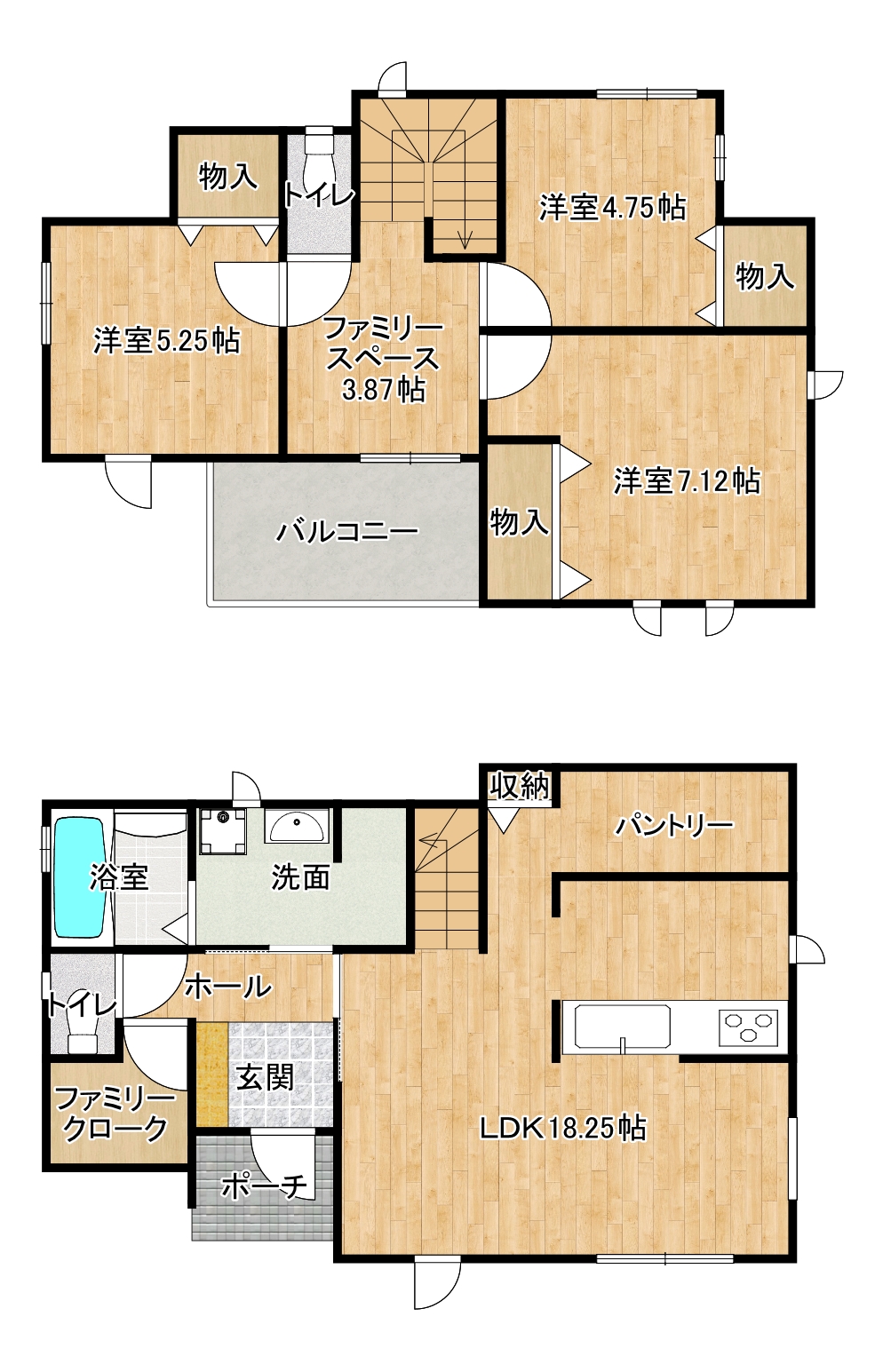 | 間取内容 | LDK18.25帖 1階 1室洋室7.12帖 2階 1室洋室5.25帖 2階 1室洋室4.75帖 2階 1室S3.87帖 2階 1室 | ||