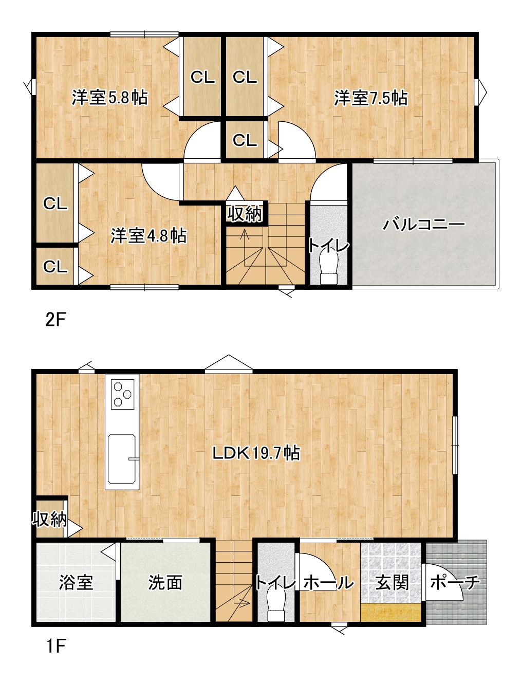| 間取内容 | LDK19.7帖 1階 1室洋室7.5帖 2階 1室洋室5.8帖 2階 1室洋室4.8帖 2階 1室 | ||
