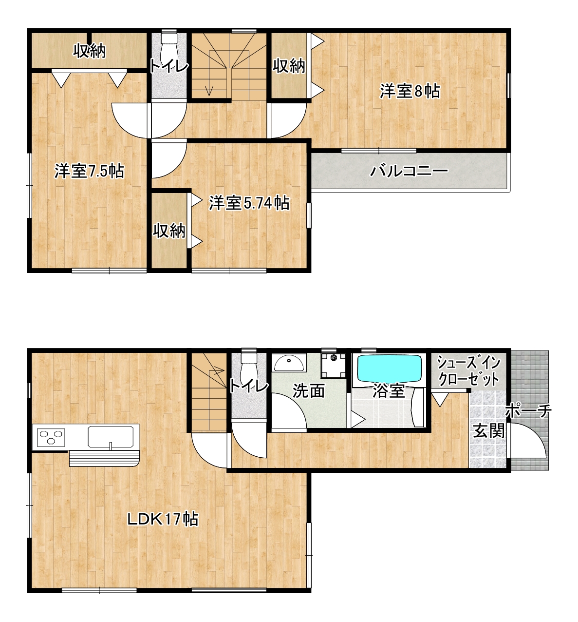 | 間取内容 | LDK17帖 1階 1室洋室8.0帖 2階 1室洋室7.5帖 2階 1室洋室5.74帖 2階 1室 | ||
