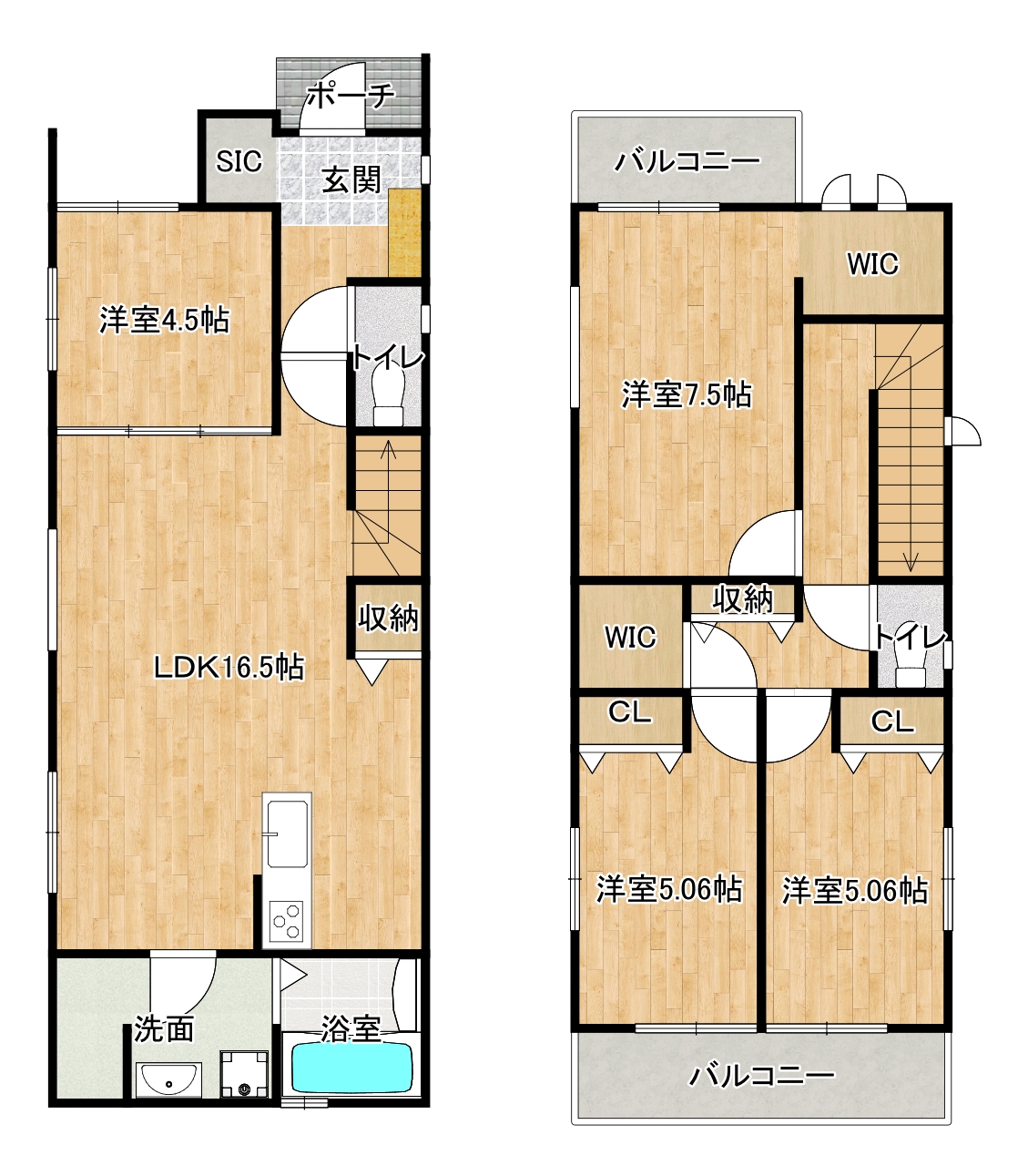 | 間取内容 | LDK16.5帖 1階 1室洋室4.5帖 1階 1室洋室7.5帖 2階 1室洋室5.06帖 2階 2室 | ||