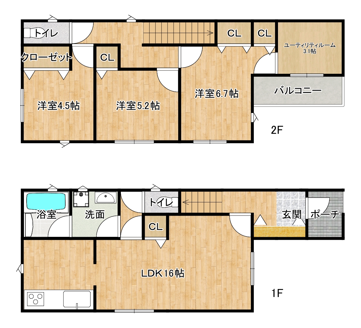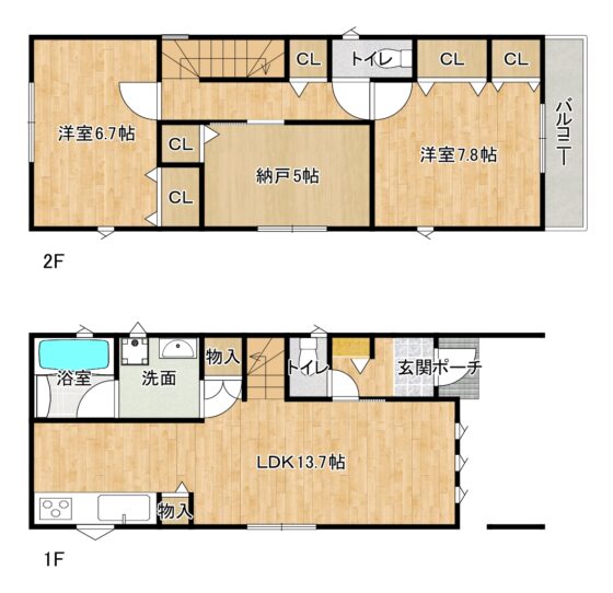 | 間取内容 | LDK13.7帖 1階 1室洋室7.8帖 2階 1室洋室6.7帖 2階 1室S5.0帖 2階 1室 | ||