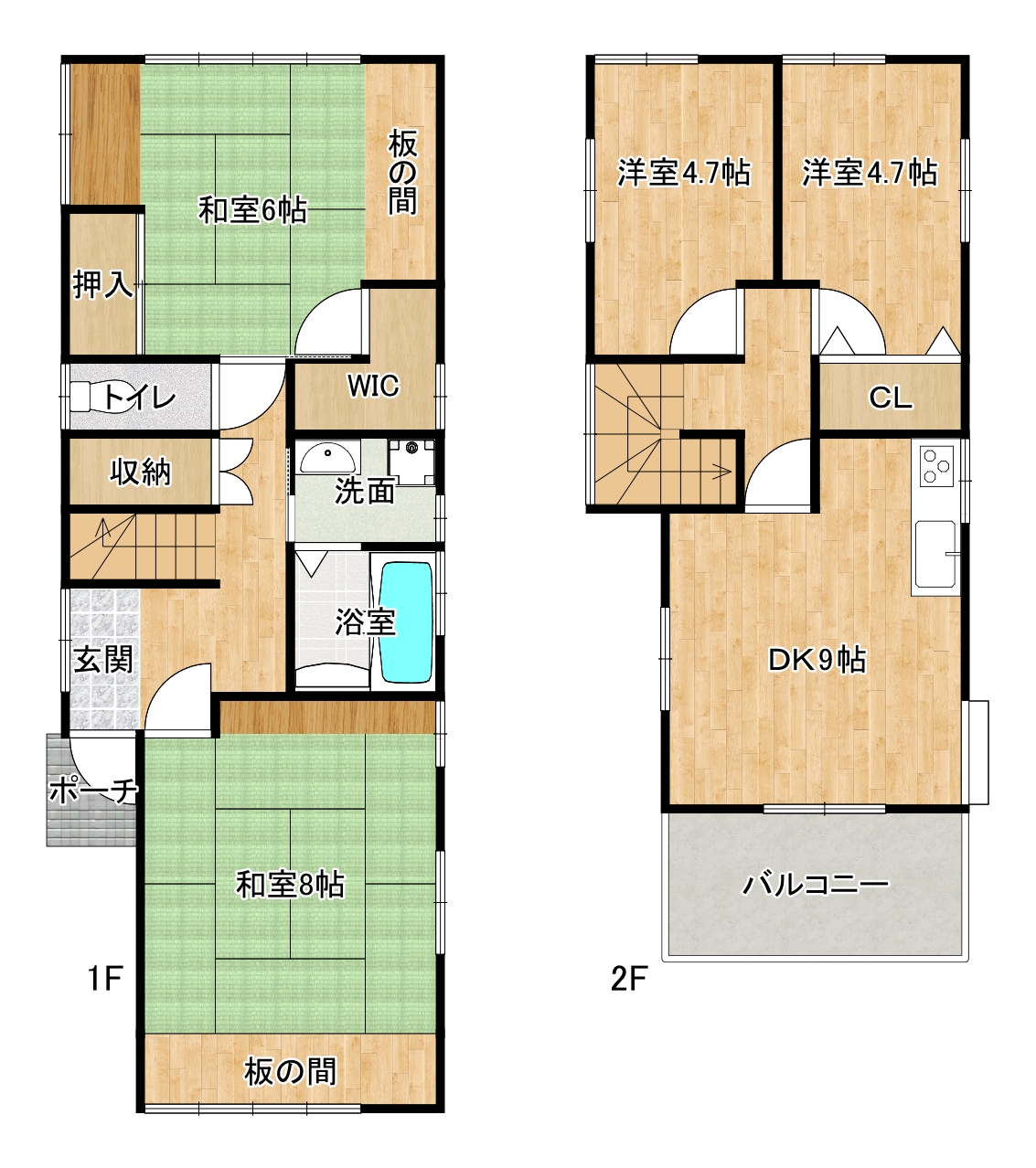| 間取内容 | DK9帖 2階 1室和室8帖 1階 1室和室6帖 1階 1室洋室4.7帖 2階 2室 | ||