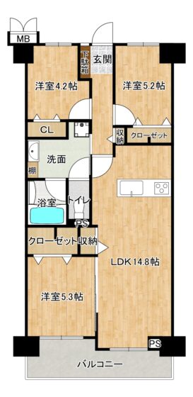 | 間取内容 | LDK14.8帖 1室洋室5.3帖 1室洋室5.2帖 1室洋室4.2帖 1室 | ||