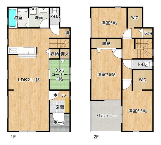 | 間取内容 | LDK21.1帖 1階 1室洋室7.5帖 2階 1室洋室6.5帖 2階 1室洋室6.0帖 2階 1室 2WIC+タタミコーナー |