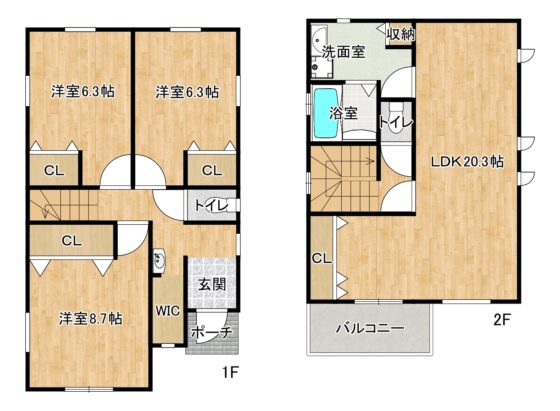 | 間取内容 | LDK20.3帖 1階 1室洋室8.7帖 2階 1室洋室6.3帖 2階 2室 | ||