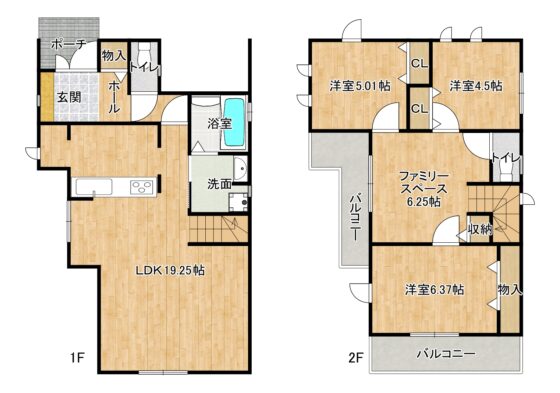 | 間取内容 | LDK19.25帖 1階 1室洋室6.37帖 2階 1室洋室5.01帖 2階 1室洋室4.5帖 2階 1室その他6.25帖 2階 1室 ファミリースペース |