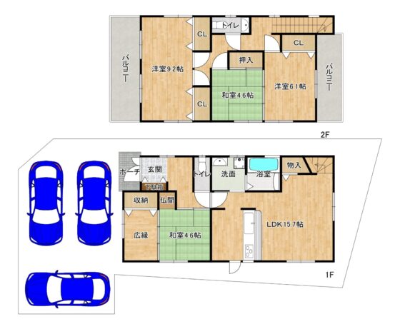 間取内容 | LDK15.7帖 1階 1室和室4.6帖 1階 1室洋室9.2帖 2階 1室洋室6.1帖 2階 1室和室4.6帖 2階 1室 | ||