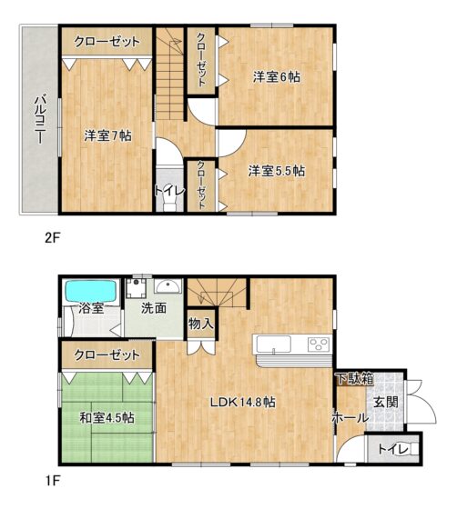 間取内容 | LDK14.8帖 1階 1室和室4.5帖 1階 1室洋室7.0帖 2階 1室洋室6.0帖 2階 1室洋室5.5帖 2階 1室 | ||
