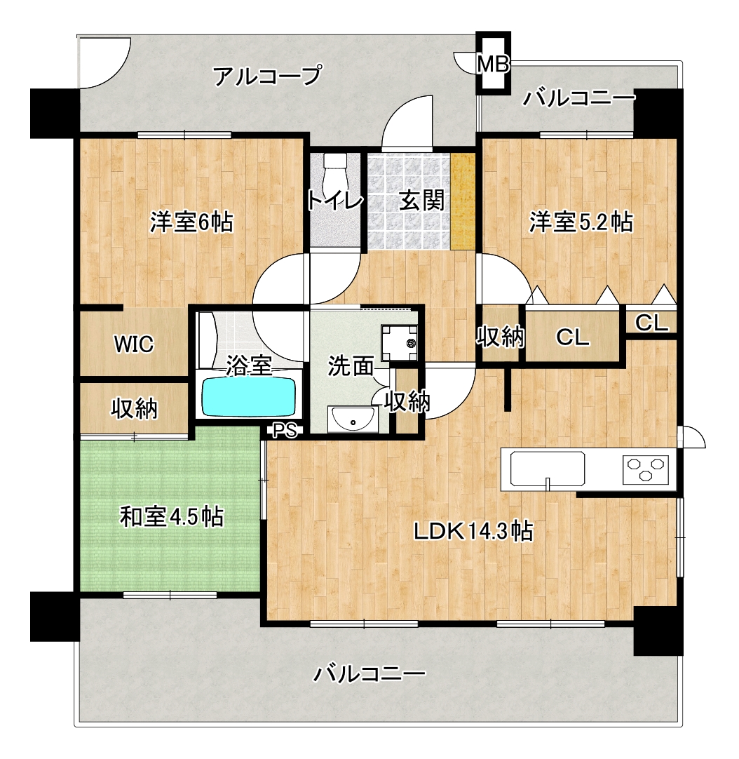 間取内容 | LDK14.3帖 1室洋室6帖 1室洋室5.2帖 1室和室4.5帖 1室 | ||