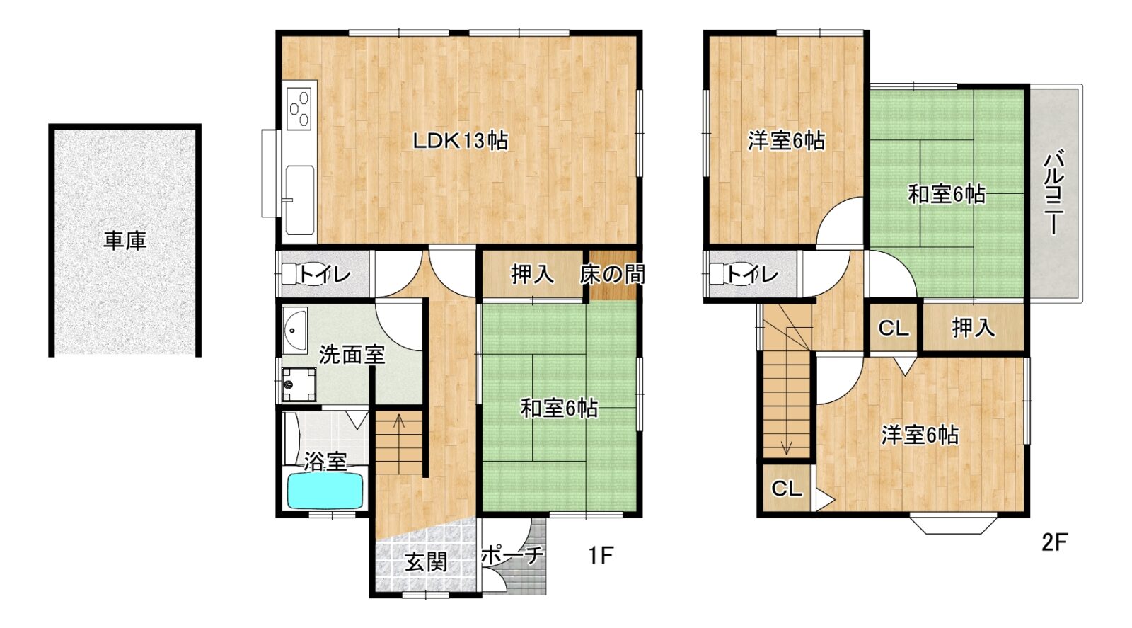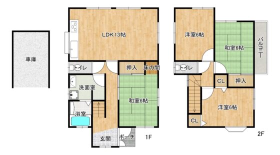 間取内容 | LDK13帖 1階 1室和室6帖 1階 1室洋室6帖 2階 2室和室6帖 2階 1室 | ||