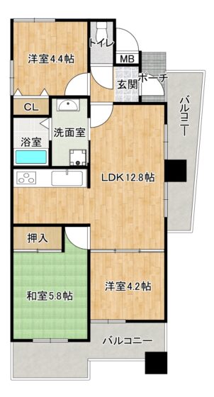 間取内容 | LDK12.8帖 1室和室5.8帖 1室洋室4.4帖 1室洋室4.2帖 1室 | ||